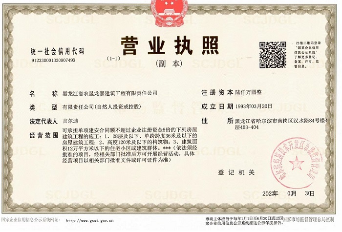 黑龙江省农垦龙嘉建筑工程有限责任公司成立于1993年3月,注册资金2000万元,具有房屋建筑施工总承包二级资质企业。